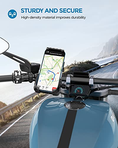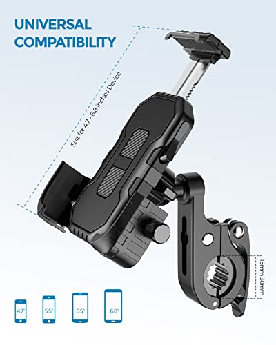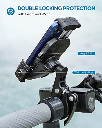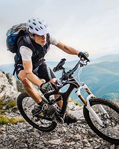 [Dubbele veiligheidsvergrendeling]: dankzij de zijknop kan de breedte worden aangepast en je telefoon verder bevestigen; door eenvoudig op de rechterknop van de telefoonhouder voor de motorfiets te drukken, kun je je telefoon ook tijdens het mountainbiken en en motorrijden veilig gebruiken.